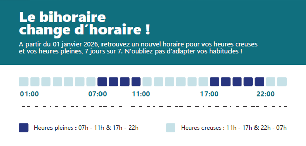 Dès le 1er janvier 2026, vos horaires d’heures pleines et heures creuses évolueront pour s’aligner sur la transition énergétique. Il y aura davantage de créneaux horaires répartis sur la journée, et le même système sera appliqué sur l’ensemble de la semaine, y compris le week-end, qui suivra désormais les mêmes règles que les jours de semaine.